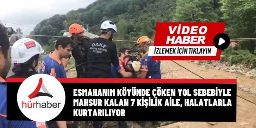 Düzce’nin Akçakoca ilçesi Esmahanım köyünde sel felaketi sebebiyle mahsur kalan 3'ü çocuk 7 kişilik aile, halatlarla kurtarılıyor.Düzce’nin Akçakoca ilçesi sınırları içerisinde yer alan Esmahanım köyünde dün etkili olan sağanak yağış sonrasında yolun çökmesi sebebiyle çok sayıda vatandaş mahsur kaldı.