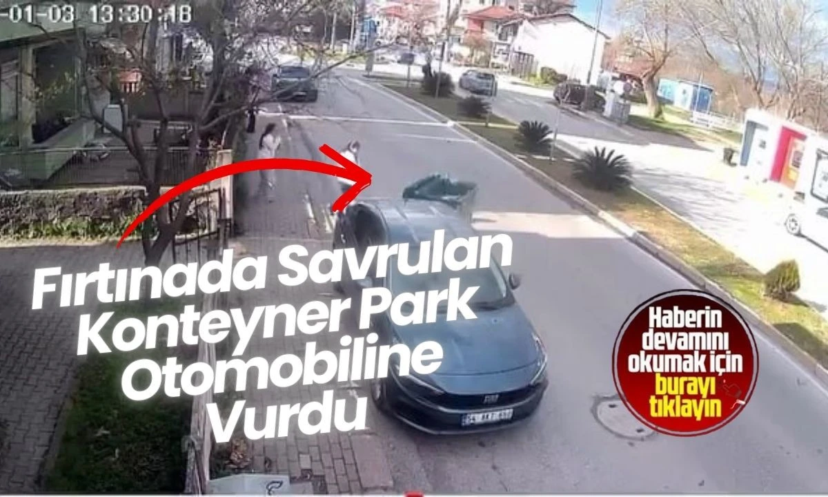 Sakarya’nın Sapanca ilçesinde fırtınanın savurduğu çöp konteyneri, park halindeki otomobile çarptı. O anlar güvenlik kamerasına yansıdı.