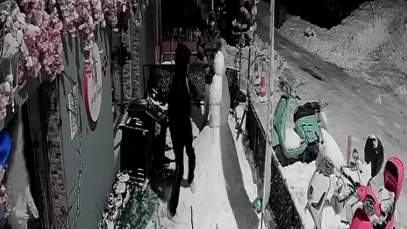 Gece saatlerinde caddeden geçen iki genç, dükkan önündeki kardan adamı fark etti. Güvenlik kamerasına yansıyan görüntülerde; gençlerden birinin kardan adamın yanından geçerken aniden duraksadığı ve bir mizansen (kurgu) başlattığı görüldü.