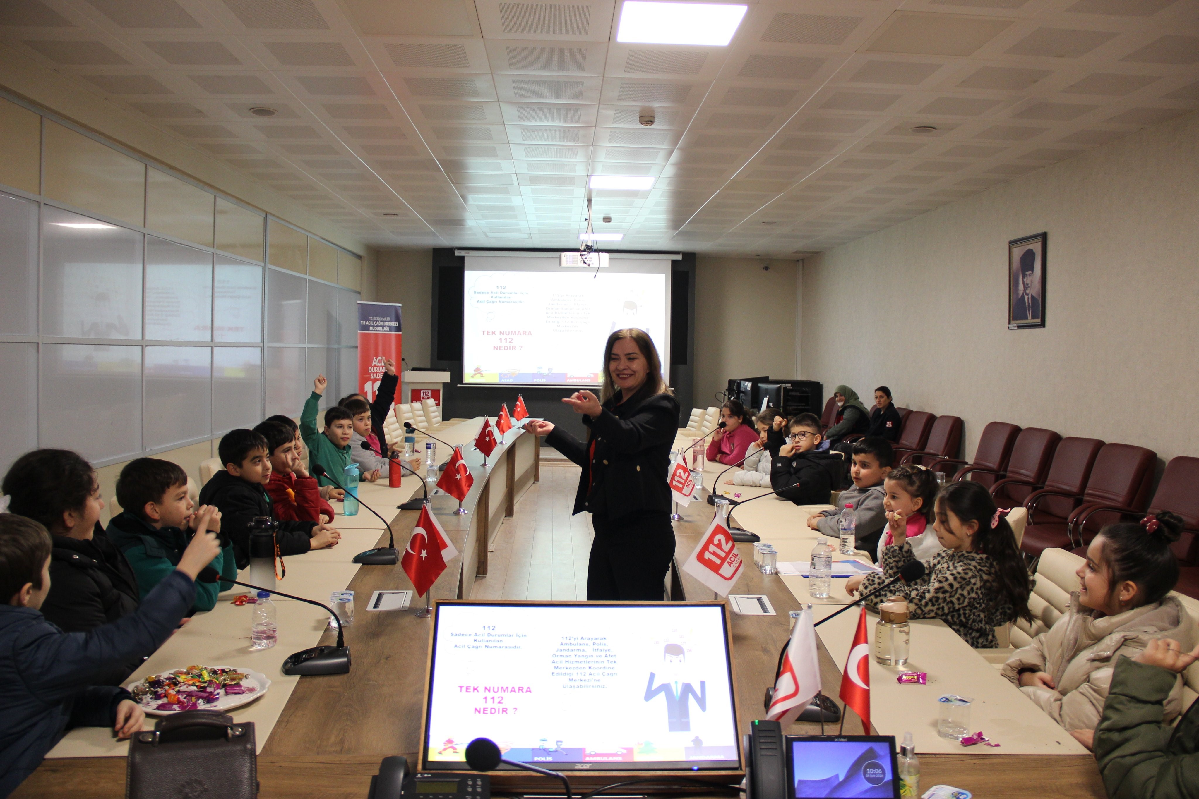 Düzce Cumhuriyet İlkokulu öğrencileri, 112 Acil Çağrı Merkezi'nin tanıtım ve bilgilendirme çalışmalarının bir parçası olarak merkezi ziyaret ettiler.