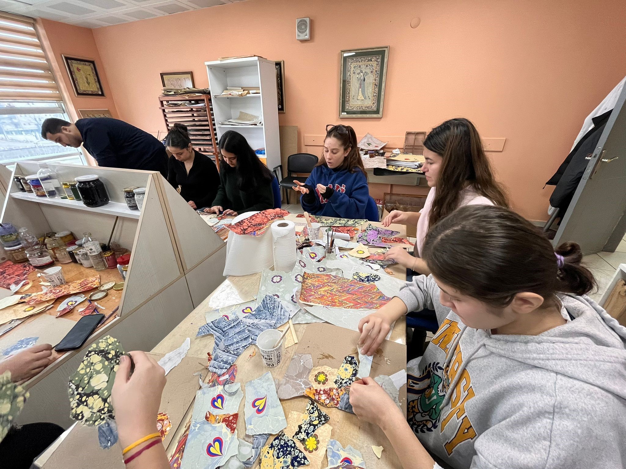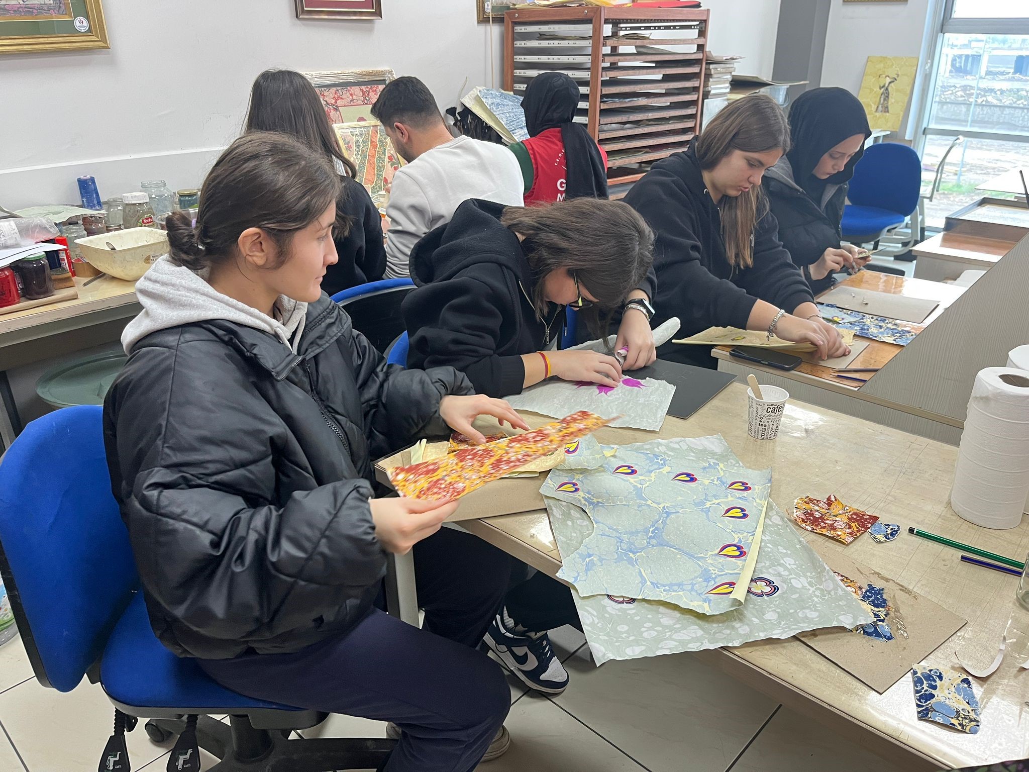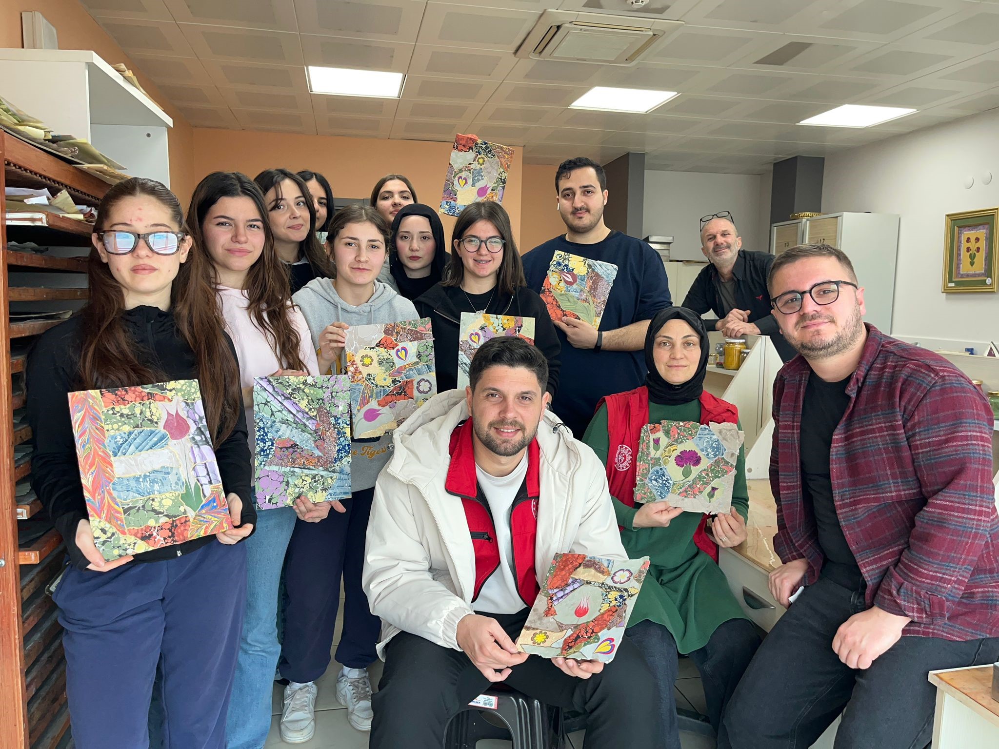 Geleneksel Türk sanatları arasında önemli bir yere sahip olan ebru sanatını yakından tanıma fırsatı bulan gençler, suyun ve renklerin uyumunu keşfederek kendi özgün çalışmalarını ortaya koydu.