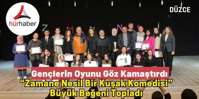 Düzce'nin genç tiyatro yeteneklerinin sahnelediği oyun göz doldurdu. 15 Temmuz Şehitler Anadolu Lisesi öğrencilerinin hazırladığı 'Zamane Nesli, Bir Kuşak Komedisi' isimli tiyatro oyunu ile büyük bir topladı. Gençlerin sahnelediği tiyatro oyununda öğrencilerin heyecan, istek ve coşkuları büyük alkış topladı.