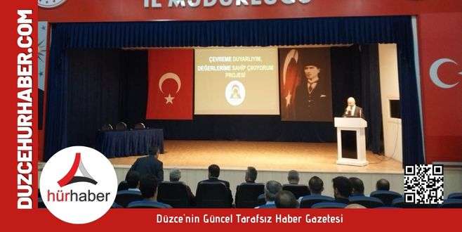 Düzce'de "Çevreme Duyarlıyım Değerlerime Sahip Çıkıyorum" projesi çerçevesinde gönüllü öğrenciler ile eğitim ve saha çalışması yapılacak.İl Müftülüğü, İl Milli Eğitim Müdürlüğü ve Gençlik Spor İl Müdürlüğü’nün iş birliğinde "Çevreme Duyarlıyım Değerlerime Sahip Çıkıyorum" projesi başlatıldı. Proje, Diyanet Gençlik Merkezleri ve ortaokulları arasında düzenlenecek. Projenin detaylarının görüşülmesi için ise Gençlik ve Spor İl Müdürlüğü'nde düzenlendi. Toplantıya İl Müftü Yardımcısı Hasan İzmirli, Spor Şube Müdürü Aytekin Keleş, koordinatörler ve müdürler katıldı.Proje çerçevesinde, gönüllü öğrenciler ile yıl boyu çeşitli eğitim ve saha çalışması yapılarak, gençlerin manevi dünyalarına etkin bir dokunuş yapılması hedefleniyor.