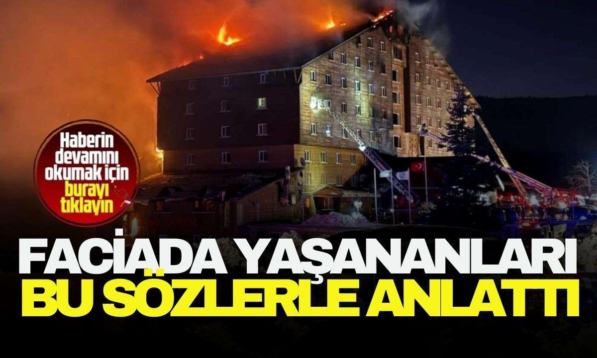 Kartalkaya Kayak Merkezi'nde çıkan ve 78 kişiyi hayattan koparan otel yangını faciasını yaşayan Begüm isimli sosyal medya kullanıcısı, yaşadıkları korku dolu anları sosyal medya hesabından yaptığı paylaşımla anlattı.Oğlu ve annesiyle birlikte otelin 7. katında konakladıklarını ifade eden vatandaş, paylaşımında, "9. kattan itfaiye eri İbrahim Bey tarafından kurtarıldık. Tekrardan çok teşekkür ediyorum, Allah sizden razı olsun. Hala biz neler yaşadık, nasıl bir felaketten kurtulduk inanamıyoruz. Cehennem gibiydi. Şoktayız. Arayan, soran, mesaj atan herkese çok teşekkür ediyorum. Allah'a şükür hayattayız, yaşıyoruz" ifadelerini kullandı.