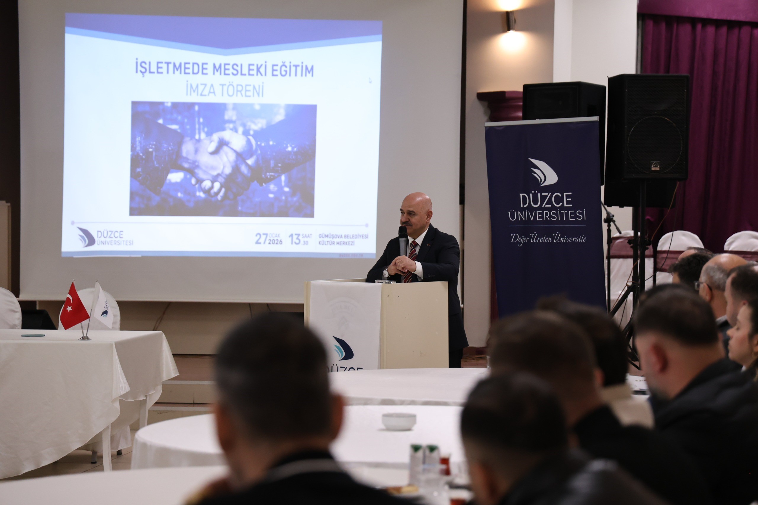 Düzce Üniversitesi Gümüşova Meslek Yüksekokulu, 3+1 işletmede mesleki eğitim uygulaması çerçevesinde özel sektör firmalarıyla kapsamlı bir iş birliğine giderek, Düzce Üniversitesi öğrencilerinin mesleki eğitimlerine yönelik protokoller imzaladı.