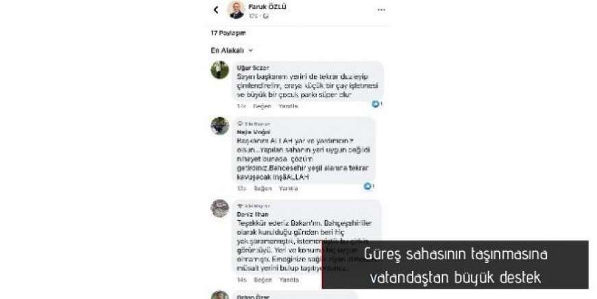 Düzce'nin Bahçeşehir bölgesinde bulunan güreş sahası tribünlerinin taşınacağının duyurulmasının ardından bölge halkı sosyal medya hesabı üzerinden Düzce Belediye Başkanı Dr. Faruk Özlü'ye hem teşekkür etti hem de destek verdi.