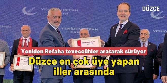 Türkiye’nin sorunlarına karşın ürettiği çözüm yolları politikalarıyla vatandaşa milli ekonomiyle refah siyaseti üreten Yeniden Refah Partisi halkın yoğun teveccühünü kazanmaya devam ediyor. Bu çerçevede Türkiye ile birlikte Düzce’de üye çalışmalarına yoğunluk veren Yeniden Refah Partisi teşkilatları ülke genelinde en çok üye yapan teşkilatlar arasında yerini alarak Genel başkan Fatih Erbakan’dan üstün başarı belgesini almaya hak kazandı.