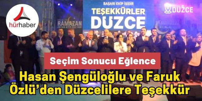 Seçimlerin kesin olmayan sonuçlarına göre Belediye başkanlığını açıklayan Faruk Özlü ve AK Parti İl Başkanı Hasan Şengüloğlu, teşekkür konuşması yaptı. Belediye başkanları, Belediye, il genel meclis üyelerinin, muhtarların ve ihtiyar heyetlerinin belirlendiği yerel yönetimler ve mahalli idareler seçimlerinin kesin olmayan sonuçlarının açıklanmasıyla birlikte AK Parti adayı ve Belediye başkanı Faruk Özlü, belediye önünde bulunan çadırda konuşma yaptı. Konuşmasında Faruk Özlü, Düzcelilere teşekkür ederek, kendisine oy verenlerinde vermeyenlerinde belediye başkanı olacağını kapılarının ve gönlünün bütün Düzcelilere açık olduğunu söyledi.