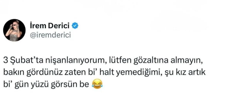 Sosyal medya hesabından 3 Şubat'ı işaret ederek "Nişanlanıyorum, lütfen gözaltına almayın. Şu kız artık bir gün yüzü görsün be!" notuyla paylaşım yapan ünlü şarkıcı, takipçilerini hem güldürdü hem duygulandırdı. İrem Derici ile 25 yaşındaki DJ Melih Kunukçu, 3 Şubat’ta aile arasında gerçekleşecek sade bir törenle nişanlanarak evlilik yolundaki ilk ciddi adımı atmaya hazırlanıyor.