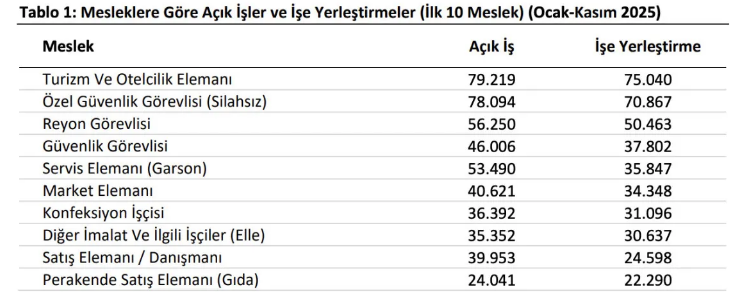 Kasım 2025 itibarıyla Türkiye’de en fazla açık iş bulunan meslekler şöyle: