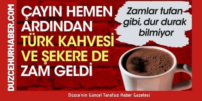 İçki zamlarıyla Çay Kur'un fiyat artışının ardından bir zam da kahve ve şekere geldi.Tekel Bayileri Platformu (TBP) Başkanı Özgür Aybaş, Cumhuriyet'e yaptığı açıklamada, Türk kahvesine yüzde 21, küp ve toz şekere ise yüzde 20 zam geldiğini açıkladı.Zamların ardından orta ölçekli işletme kalmayacağını belirten Aybaş, "Sadece alkol ve sigara zammı kendi başına zaten seküler yaşama müdahale. Bu zamlarla kaçağın önü kesilmez. Vatandaş çareyi isyan etmekten ziyade kaçağı seçerek zamları kanıksıyor. Herkes kendi bütçesine göre haklı" ifadelerini kullandı.