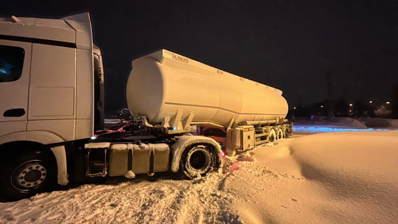 Düzce'nin komşu ili Bolu'da etkisini artıran yoğun kar yağışı nedeniyle Abant Gişeleri bağlantı yolunda bir tır kontrolden çıkarak şarampole kaydı.