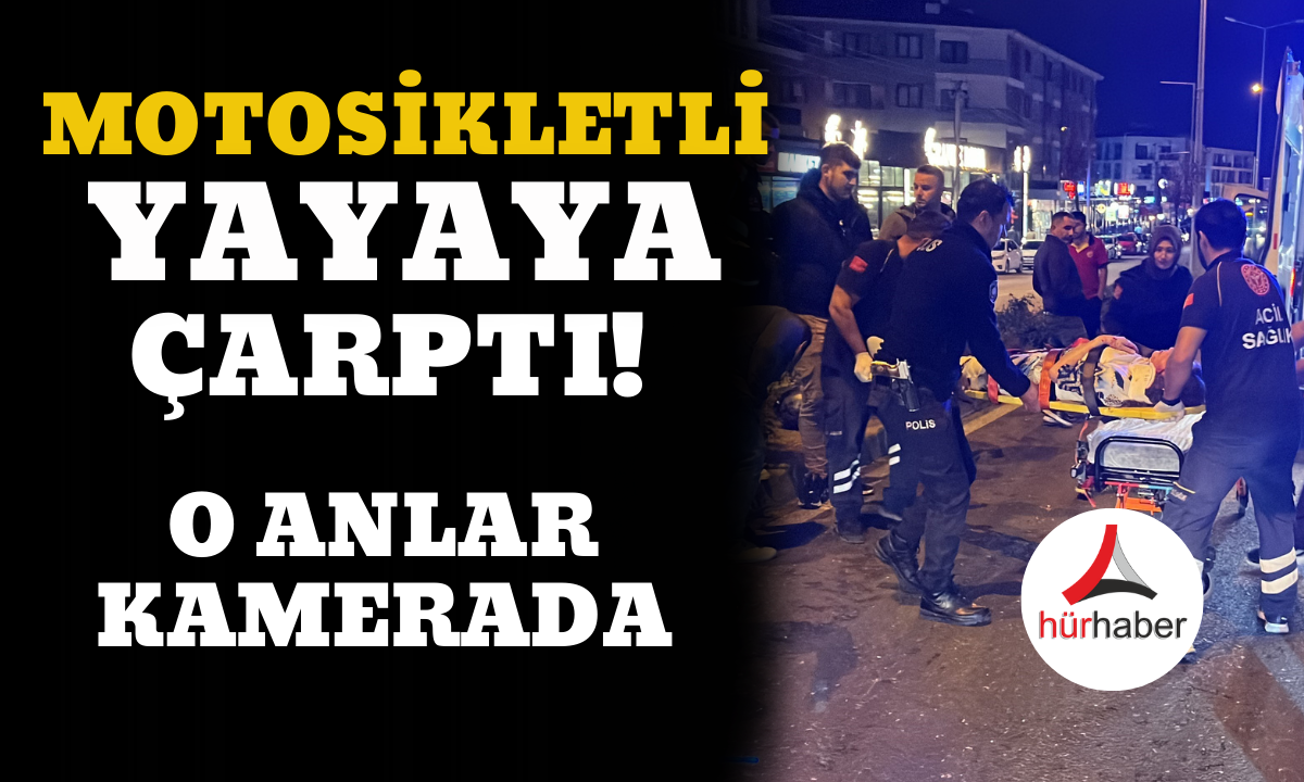 Düzce'de kayganlaşan yolda duramayan motosikletli yayaya çarptı. Yaya metrelerce havaya uçarak savrulurken kaza anı güvenlik kamerasına yansıdı.