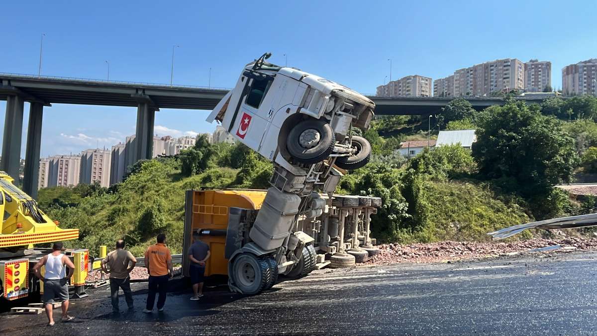 Kocaeli'nin İzmit ilçesinde asfalt çalışmaları sebebiyle ulaşıma kapalı olan yolda mıcır taşıyan tır devrildi. Kazada tırın kupası şaha kalktı.