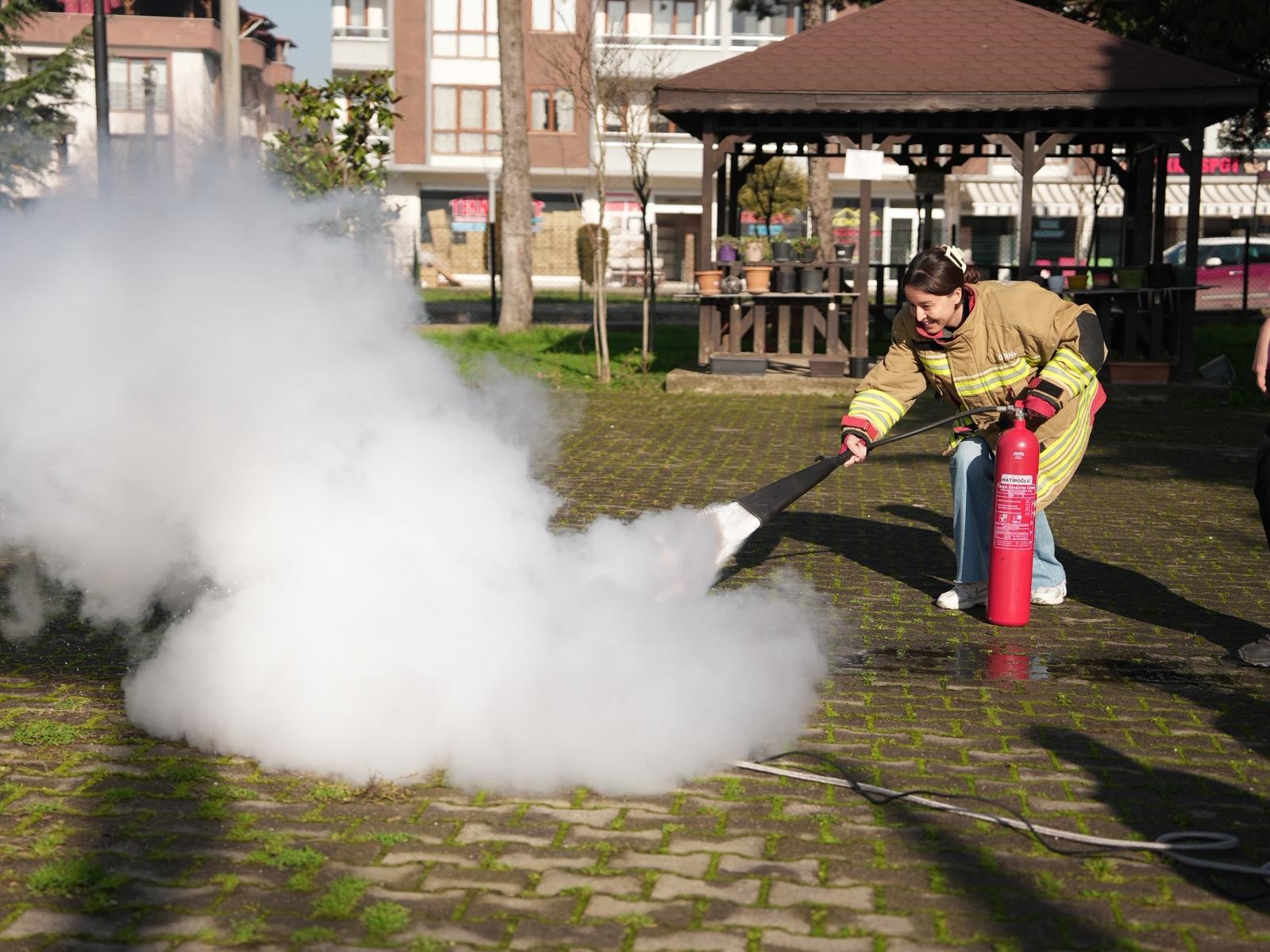 Belediye tarafından düzenlenen kurslara katılan kadınlar bu sefer yangına müdahaleyi öğrendi. Düzce Belediyesi İtfaiye Müdürlüğü, toplumun tüm kesimlerini yangın konusunda bilinçlendirmeye yönelik eğitim ve bilgilendirme çalışmalarını sürdürüyor. 2025 yılı içerisinde gerçekleştirdiği eğitim faaliyetleriyle yaklaşık 4 bin kişiye yangın farkındalığı kazandıran itfaiye ekipleri, bu yıl da çalışmalarına aralıksız devam ediyor.
