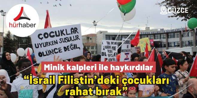 Filistinli kardeşlerine destek için hazırladıkları pankartları taşıyarak yüzlerce çocuk “Katil İsrail kardeşlerimizi rahat bırak” sloganları attı. Programda çocuklar Kuran-ı Kerim ve şiirler okudu. Düzceli minikler Filistin’deki çocuklar için sloganlar atarak İsrail’in kanlı saldırılarını durdurmasını istediler.