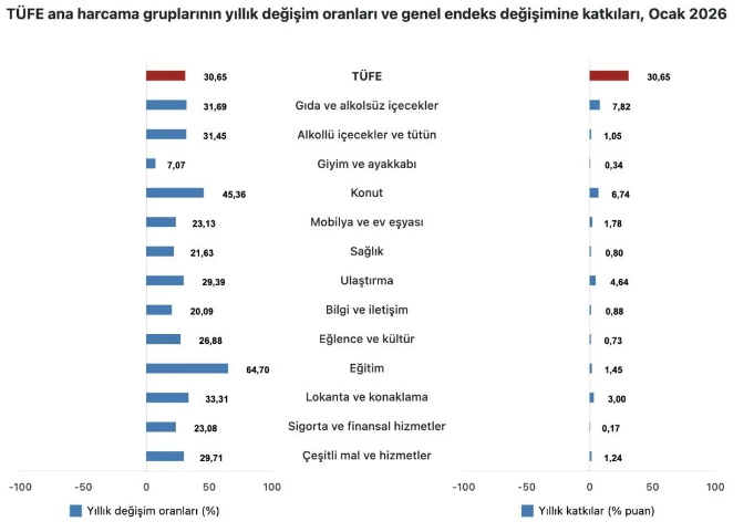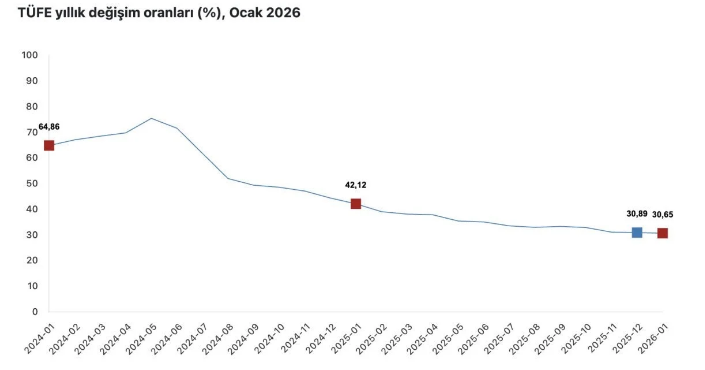 Piyasalar ve vatandaşlar ocak ayı enflasyon verisine odaklandı. Son dakika haberine göre Türkiye İstatistik Kurumu (TÜİK), Ocak 2026 Tüketici Fiyat Endeksi (TÜFE) verilerini paylaştı.TÜFE'deki değişim 2026 yılı Ocak ayında, bir önceki aya göre yüzde 4,84 artış, bir önceki yılın aralık ayına göre yüzde 4,84 artış, bir önceki yılın aynı ayına göre yüzde 30,65 artış ve on iki aylık ortalamalara göre yüzde 33,98 artış olarak gerçekleşti.