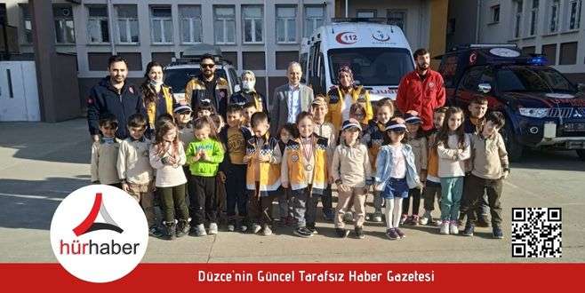 Düzce Sağlık Müdürlüğü tarafından okullarda sağlık okuryazarlığının gelişmesi için anaokulu ve ilkokul çocuklarına yönelik Minik Öğrenciler 112’yi öğreniyor eğitimleri devam ediyor.Sağlık Müdürlüğü Ambulans Servisi Başhekimliği ekiplerince; Minik 112 Projesi dahilinde, Mehmet Akif Ersoy Anaokulu ve İlkokulu’nda öğrencilere acil sağlık hizmetleri ve ambulans tanıtıldı.