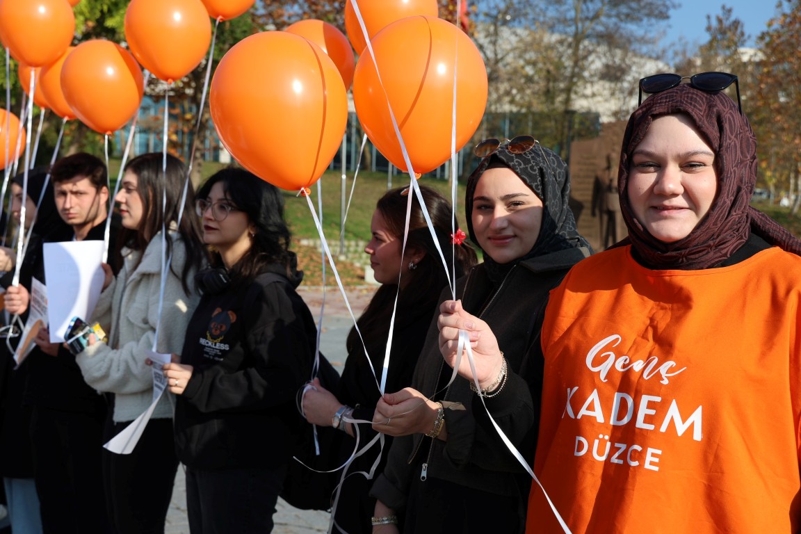 Düzce Üniversitesi 15 Temmuz Demokrasi Meydanı'nda bir araya gelen Düzce Üniversitesi öğrencileri, kadına yönelik şiddete karşı dikkat çekmek ve bilinç oluşturmak amacıyla turuncu balonları gökyüzüne uçurdu.