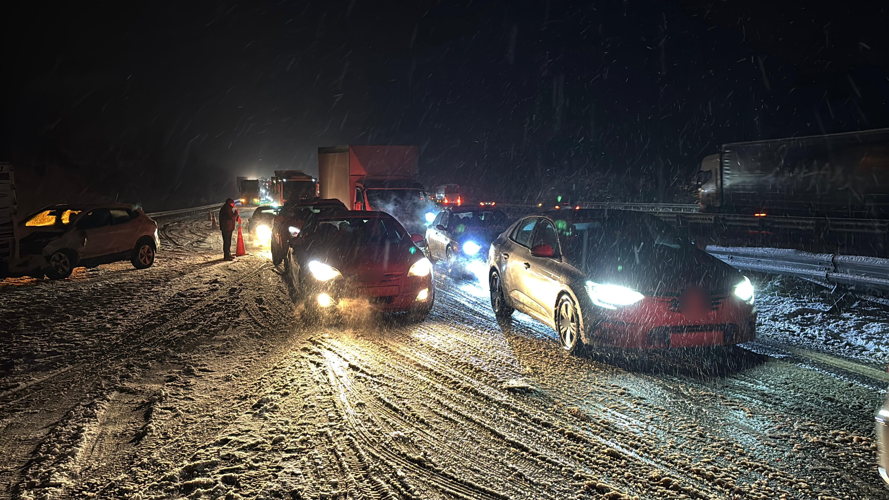 Görüş mesafesinin düştüğü ve zeminin karla kaplandığı yolda; 3 otomobil, 2 tır, 1 yolcu otobüsü ve 1 kamyonet birbirine girdi.