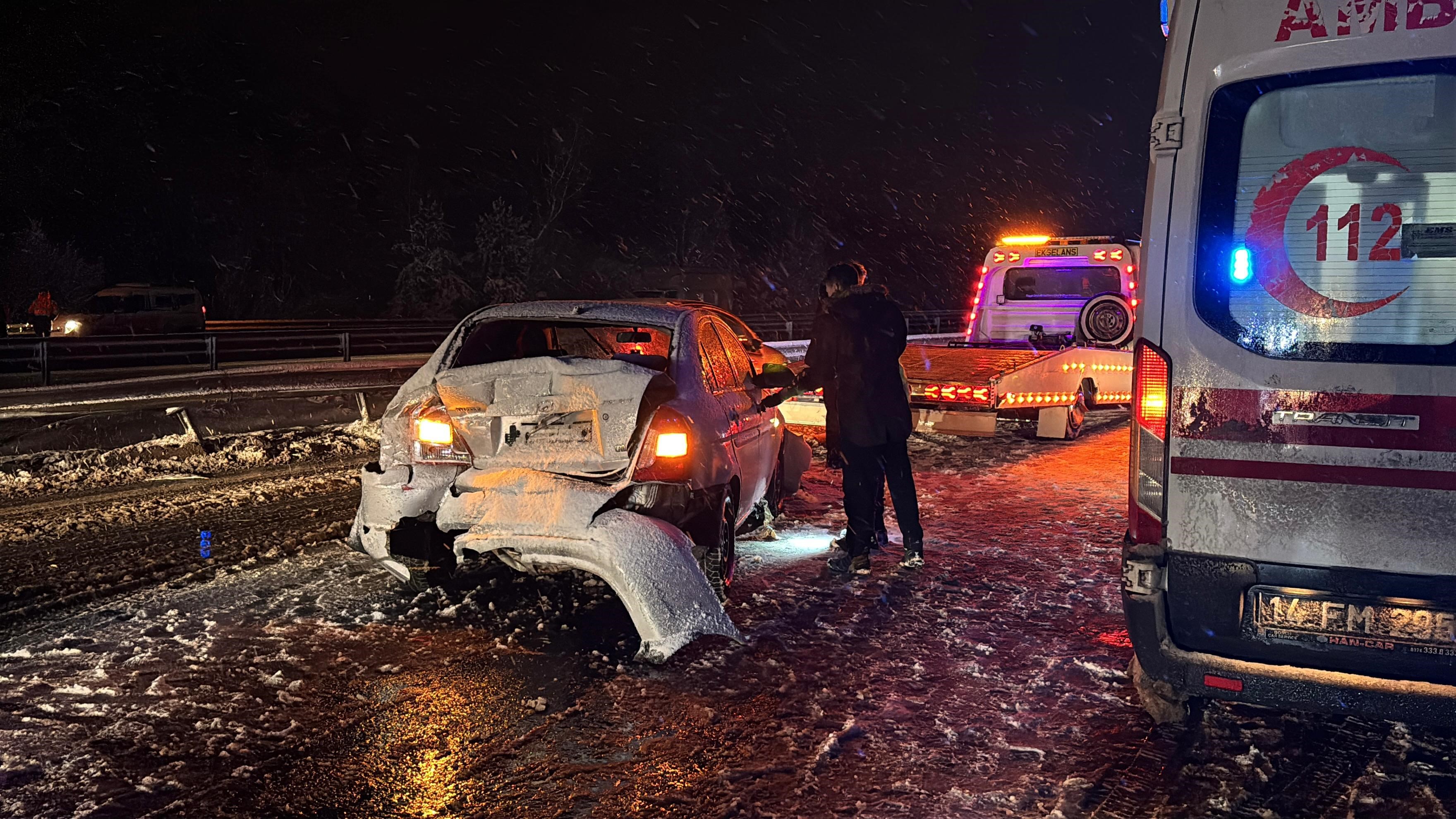 Bolu’da etkili olan yoğun kar yağışı nedeniyle TEM Otoyolu'nda 3 otomobil, 2 tır, 1 yolcu otobüsü ve 1 kamyonetin karıştığı zincirleme kazada 2 kişi yaralandı.
