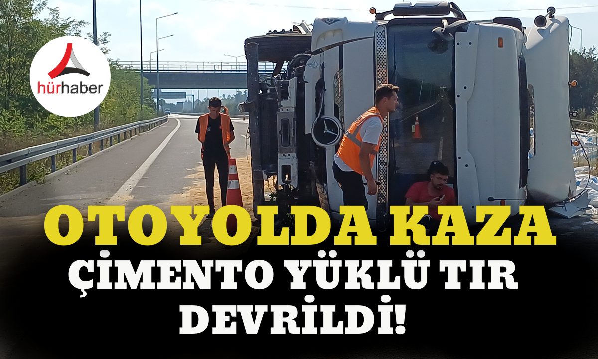 TEM Otoyolu'nun Düzce kesiminde çimento yüklü tır, sürücüsünün direksiyon hakimiyetini kaybetmesi sonucu devrildi. Kazada hafif şekilde yaralanan sürücü çaresizce yardım gelmesini bekledi.