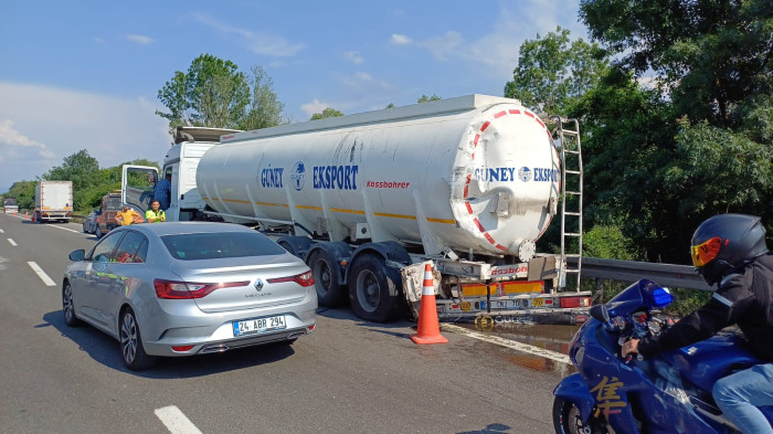 Anadolu Otoyolu'nda meydana gelen kazada İstanbul İstikametinden Ankara istikametine giden tanker ile aynı istikamete giden tır çarpıştı. Tırda bulunan 2’si çocuk 5 kişi yaralandı. Tırın sürücü mahallinde sıkışan yolcu için itfaiye ekipleri seferber olurken uzun uğraşlar sonucu yolcu sıkıştığı yerden kurtarıldı.