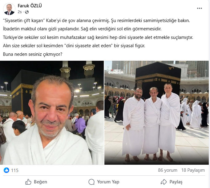 “‘Siyasetin çift kaşarı’ Kabe’yi de şov alanına çevirmiş. Şu resimlerdeki samimiyetsizliğe bakın. İbadetin makbul olanı gizli yapılanıdır. Sağ elin verdiğini sol elin görmemesidir. Türkiye’de seküler sol kesim, muhafazakâr sağ kesimi hep dini siyasete alet etmekle suçlamıştır. Alın size seküler sol kesimden ‘dini siyasete alet eden’ bir siyasal figür. Buna neden sesiniz çıkmıyor?” dedi