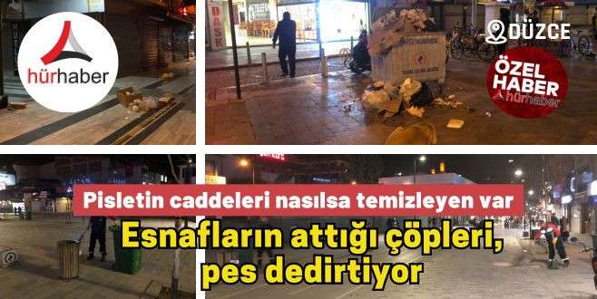 Esnafların attığı çöpleri temizlemek ise Belediye Temizlik İşleri ekiplerine kalıyor.Esnaflarının kaldırımlara bıraktığı çöpler, şehir merkezini akşam saatlerinde çöp deryası haline getiriyor. Şehir merkezi katı atık deposuna dönerken Düzceliler, iş çıkışında aileleriyle birlikte gezmek için çıktığı cadde ve sokakların görüntüsü ise 'pes' dedirtiyor. Vatandaşlar isyan ederken, özellikle çöp konteynırlarının diplerine ve kaldırımlara gelişi güzel bırakılan çöpler ilerleyen saatlerde sokak hayvanları tarafından dağıtılıyor. Bu durum ise şehir merkezinde nahoş görüntülerin ortaya çıkmasına sebep oluyor.