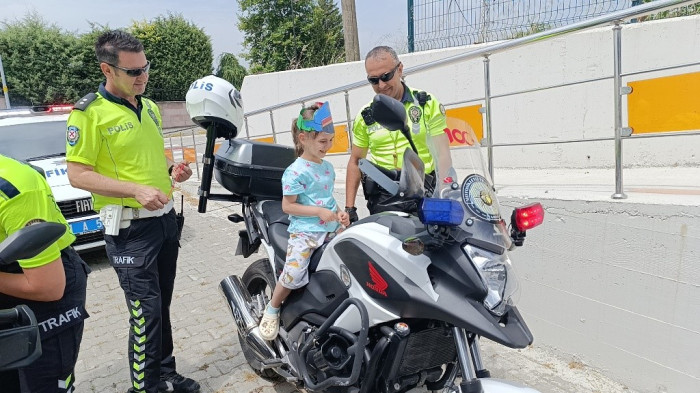 Minik öğrencilere kırmızı düdük hediye eden polisler, ailelerin kurallara uymaması durumunda bu düdüklerin yüksek sesle öttürülmesini ve ailelerin uyarılması gerektiğini vurguladılar. Sınıflarda yapılan eğitimlerin ardından minik öğrenciler trafik polislerinin motorlarına ve ekip otolarına binerek siren çalıp, anons yaparak eğlenceli zaman geçirdi.