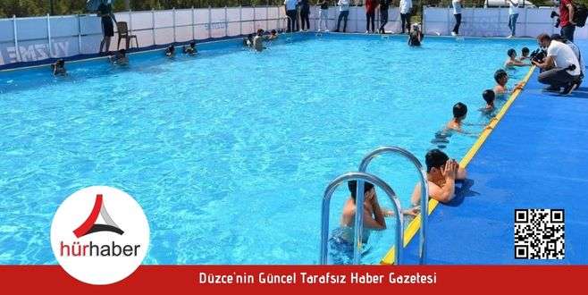 Düzce'de "Yüzme Bilmeyen Kalmasın" projesi çerçevesinde portatif yüzme havuzu hizmete açılacak.Gençlik ve Spor Bakanlığının öncülüğünde başlatılan "Yüzme Bilmeyen Kalmasın" projesi çerçevesinde Düzce'de yapımı tamamlanan portatif yüzme havuzu hizmete açılıyor. 18 Temmuz Spor Salonu yanı, eski tenis kortunun olduğu alana yapılan portatif havuzda kurslar da başlayacak.