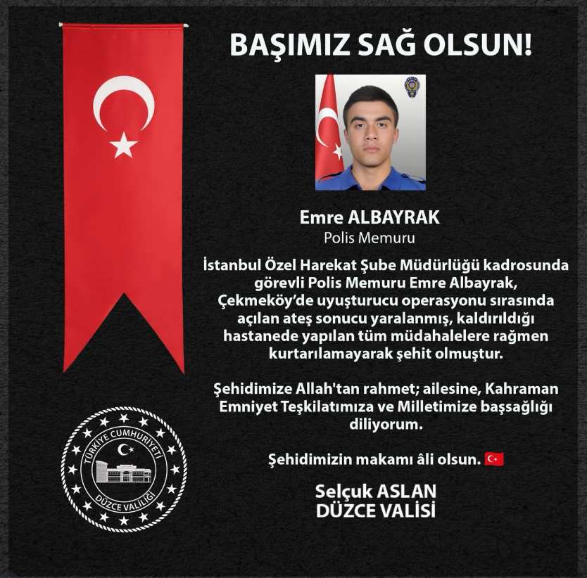 Düzce Valiliği, İstanbul Özel Harekat Şube Müdürlüğü'nde görev alan değerli polis memuru Emre Albayrak'ın, Çekmeköy'de düzenlenen bir uyuşturucu operasyonu sırasında yaşanan çatışma neticesinde ağır yaralanarak hastaneye sevk edildiğini ve burada doktorların tüm çabalarına rağmen kurtarılamayarak şehit olduğunu derin bir üzüntüyle duyurdu. Valilik tarafından yapılan açıklamada, şehit polis memuru için taziye mesajı yayınlandı.
