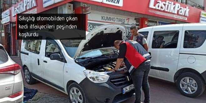 Sıkıştığı otomobilden çıkan kedi itfaiyecileri peşinden koşturdu