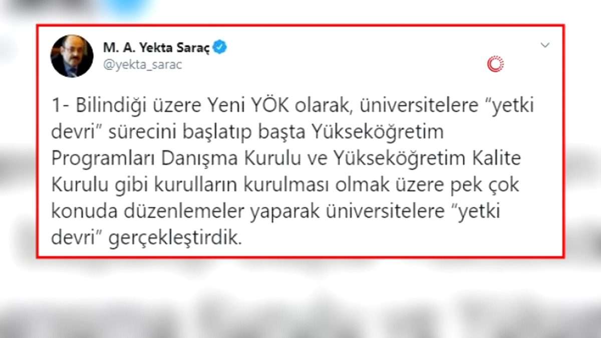 Saraç, Twitter hesabından yaptığı paylaşımda, Yeni YÖK olarak, üniversitelere "yetki devri" sürecini başlatıp, başta Yükseköğretim Programları Danışma Kurulu ve Yükseköğretim Kalite Kurulu gibi kurulların kurulması olmak üzere pek çok konuda düzenlemeler yaparak üniversitelere "yetki devri" gerçekleştirdiklerini anımsattı.