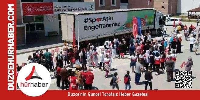 Cumhurbaşkanlığı, Gençlik ve Spor Bakanlığı ile Milli Eğitim Bakanlığının ortak projesi "Spor Aşkı Engel Tanımaz" çerçevesinde özel eğitim okullarına, farklı engel gruplarının kullanımına sunmak üzere üretilmiş spor malzemeleri taşıyan tır Düzce’ye geldi.Özel bireylerin yararlanabilmesi amacıyla yola çıkan malzeme yüklü tır için Düzce’deki Bahçeşehir Spor Kompleksinde Gençlik ve Spor Müdürü İsa Yazıcı, sporcular, engelli bireyler ve ailelerin katılımıyla karşılama töreni düzenlendi. Farklı engelli gruplarının kullanımı için özel olarak üretilmiş spor malzemelerini taşıyan tır ile gelen malzemeler, özel uygulama okullarına dağıtılacak.