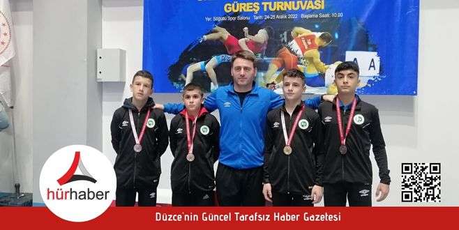 Düzce Belediyesi Spor Akademisi çatısı altında mücadele eden güreş sporcuları, Kocaeli ve Bursa’nın ardından Sakarya’da düzenlenen serbest güreş turnuvasında da büyük bir başarı sergileyerek 20 takım arasında üçüncü oldu.Düzce Belediyesi Spor Akademisi, güreş sporcularının elde ettiği başarılarla göz doldurmaya devam ediyor. Sporcular, Kocaeli ve Bursa’da katıldıkları turnuvalarda gösterdikleri başarılarına Sakarya’da düzenlenen Secati Eker Serbest Güreş Turnuvası'nı da ekledi. Söğütlü Belediyesi tarafından düzenlenen ve 20 takımdan 190 sporcunun mücadele ettiği U-15 yaş turnuvasında ilk olarak 38 kilogramda mindere çıkan Kazım Görgün ile birincilik elde etti.Ardından mindere çıkan 41 kilogramda Ensar Demirbayraklı ikinci olarak kürsüye çıkarken, 48 kilogramda mücadele eden Göktuğ Akbal birinci, Kaan Çıldır ise üçüncü olarak turnuvayı tamamladı.Elde edilen sonuçlar çerçevesinde takım klasmanında ise üçüncülüğü elde etti.