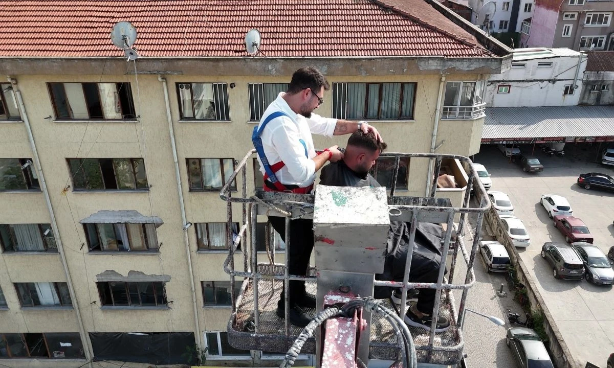 Düzce'de berber Barış Kahya, yeni açtığı dükkanının ilk tıraşını vinç sepetiyle yerden 20 metre yükseklikte yaptı."Süpürme derdi yoktu"