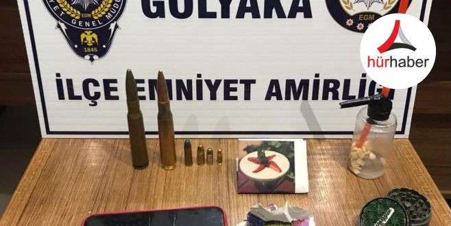 Düzce'nin Gölyaka ilçesinde polis ekiplerince yapılan rutin denetimde hareketlerinden şüphelenilen şahıs durduruldu. Şahsın üzerinde yapılan aramada uyuşturucu madde ele geçirildi. Şahsın evinde yapılan aramada ise uçak savar mermileri ile uyuşturucu madde kullanımı aparatları ile 12 gram esrar ele geçirildi. Şahıs gözaltına alınırken, mermilere el konuldu.