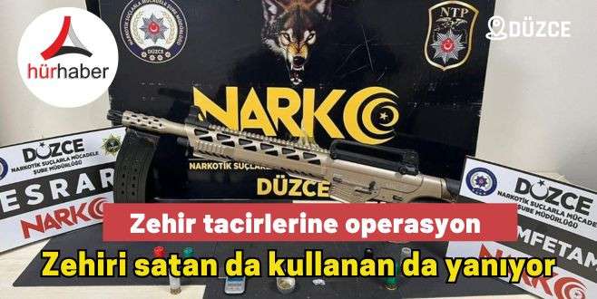 Düzce’de polis ekipleri tarafından yapılan operasyonda metamfetamin, esrar, hassas terazi ve otomatik av tüfeği ele geçirildi.