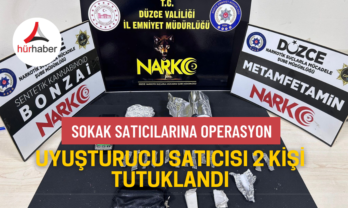 Düzce’de polis ekipleri tarafından sokak satıcılarına yönelik yapılan çalışmada yapılan fiziki takiplerden uyuşturucu madde sattığı delillendirilen G.M.B. ve F.K. tutuklandı. Şahıslarla birlikte bir miktar uyuşturucu ele geçirildi.
