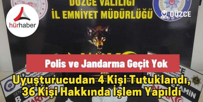 Düzce'de, polis ve jandarma narkotik suçlarla mücadele ekiplerinin yaptığı operasyonlarda 36 kişi şakalandı 4 şahıs tutuklandı.