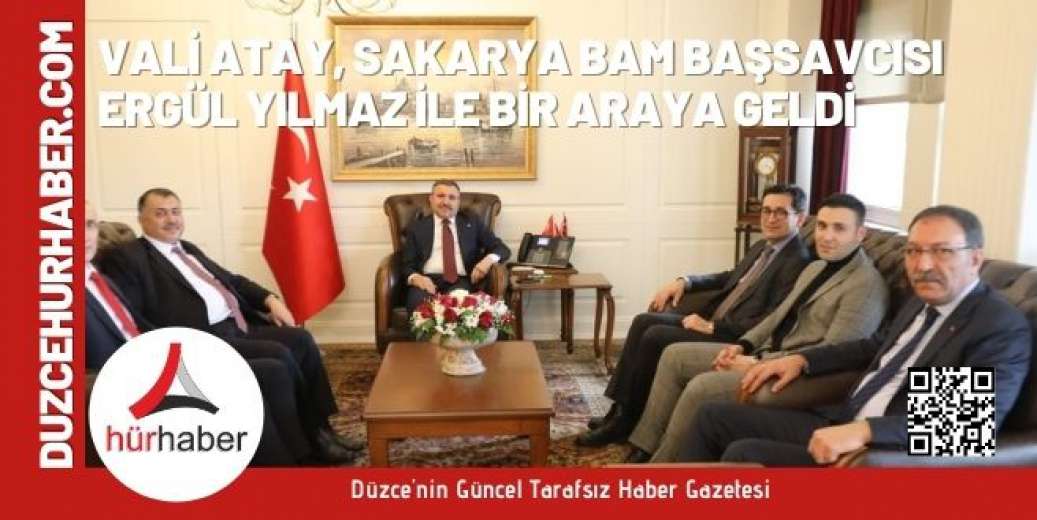 Sakarya Bölge Adliye Mahkemesi Cumhuriyet Başsavcısı Ergül Yılmaz ve beraberindeki heyet, Düzce Valisi Cevdet Atay’ı makamında ziyaret etti.Sakarya Bölge Adliyesi Mahkemesi Cumhuriyet Başsavcısı Ergül Yılmaz, cumhuriyet savcıları Erdal Yüce ile Bülent Cansu ve Hakim Buğra Türker, Düzce Valisi Cevdet Atay'ı makamında ziyaret etti. Ziyarette, Düzce Cumhuriyet Başsavcısı Sedat Çelik de yer aldı. Görüşmede, Düzce Adalet Sarayı ve kent gündemine ilişkin görüş alışverişinde bulunuldu.