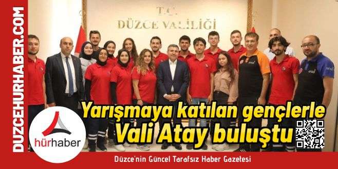 AFAD ve Gençlik ve Spor Bakanlığı iş birliğiyle Kastamonu gençlik kampında düzenlenen Gençler ve Gönüllüler Yarışıyor etkinliğine katılan Düzce Üniversitesi öğrencileri, Vali Cevdet Atay ile buluştu.AFAD’ın Gençler ve Gönüllüler Yarışıyor etkinliği çerçevesinde, “Üniversiteler Arası Arama ve Kurtarma Yarışması”, “Afet ve Gönüllülük Konulu Fotoğraf Yarışması” ve “Liseler Arası Afetler Konulu Kompozisyon ile Afetlerde Gönüllülük Konulu Resim Yarışmasında” Düzce Üniversitesi’nden de öğrenciler katılım sağladı. 25 ildeki 32 üniversitede öğrenim gören toplam 448 öğrencinin katıldığı Üniversiteler Arası Arama ve Kurtarma Yarışmasının ardından ile dönen üniversite öğrencileri Vali Cevdet Atay ile bir araya geldi. Yaptıkları çalışmalar hakkında öğrenciler Atay’a bilgiler verdi.