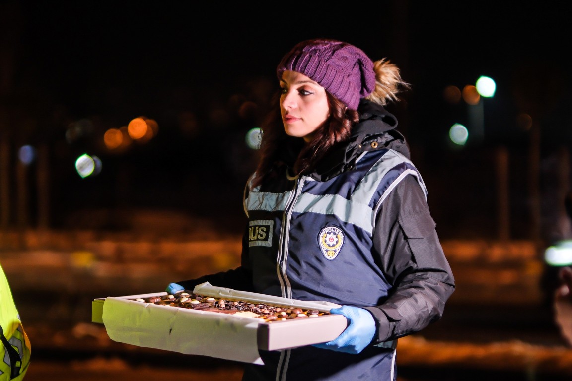 Etkinlik alanlarından çıkan sürücülere yapılan denetimlerde alkolsüz olan sürücülere kurallara uymalarından ötürü polis ekiplerine çikolata ikram edildi.