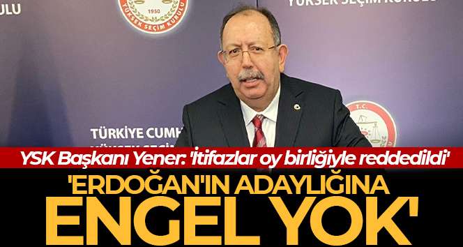 Cumhurbaşkanı adaylığı için başvuran ve gerekli şartları tamamlayan dört adaydan üçünün hakkında itiraz olduğunu ve bu itirazların değerlendirildiğini söyleyen Yener, "Kurumumuzun gündeminde olan bir diğer konu Cumhurbaşkanlığı ve 28. dönem milletvekili seçimine yönelik olarak 18 Mart 2023 tarihinde ilan edilen seçim takvimindeki sürece göre Resmi Gazetede geçici Cumhurbaşkanı adaylarının listesi ilan edilmiş, Çarşamba günü itibarıyla saat 17.00 itibariyle itirazlar sona ermiş, dün ve bugün yapılan çalışmalarda söz konusu itirazlar değerlendirilmiştir. Kurulumuza alfabetik sıraya göre Kemal Kılıçdaroğlu'nun, Muharrem İnce'nin ve Recep Tayyip Erdoğan'ın geçici aday listesinde yapılan ilanlarına itirazda bulunulmuş ve cumhurbaşkanı olamayacakları yönünde itiraz yapılmıştır. Kurulumuz her üç adaya yönelik olarak yapılan itirazları değerlendirmiş ve yapılan değerlendirme sonucunda Türkiye Cumhuriyeti Anayasası'nın 77, 101, 106 ve 116. maddeleri ve 6271 sayılı cumhurbaşkanlığı seçimi kanununun 3, 6, 8 ve 8a maddeleri birlikte değerlendirilmiş ve yapılan değerlendirmeler sonucunda oy birliğiyle her üç aday yönünden alfabetik olarak tekrarlıyorum Kemal Kılıçdaroğlu, Muharrem İnce, Sayın Recep Tayyip Erdoğan'ın adaylıklarına yönelik itirazların reddine karar verilmiş ve alfabetik olarak Kemal Kılıçdaroğlu, Muharrem İnce, Recep Tayyip Erdoğan ve Sinan Oğan'ın kesin aday listesinde bulunduklarına karar verilmiş olup karar ilan edilmek üzere bugün Resmi Gazete'ye gönderilecektir. Cumartesi günü saat 14.00 itibarıyla da cumhurbaşkanı adaylarının birleşik oy pusulasındaki yerlerinin belirlenmesi için kura çekimi yapılacaktır" diye konuştu.
